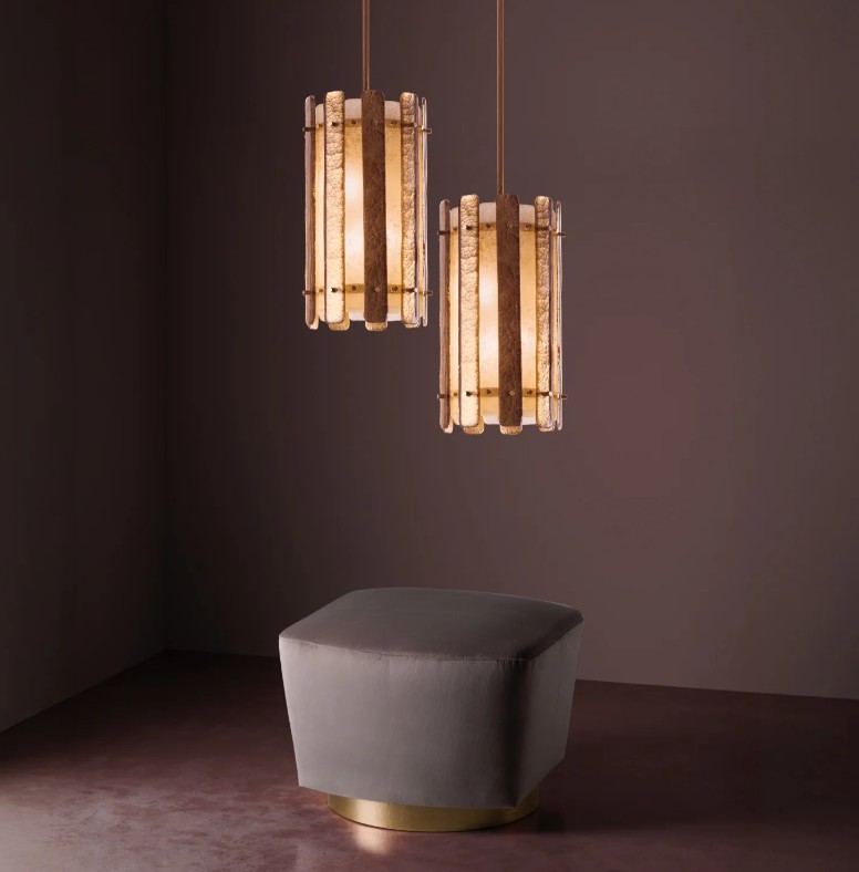 Kompozycja z matowego i barwionego szkła Murano ukrywa refleksy światła w regularnych odstępach, nadając sylwetce lampy wyjątkową głębię i fakturę.