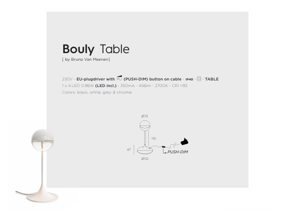 Bouly naprawdę pozwala sobie na zabawę „krzywiznami”, choć pod każdym innym względem jego stonowany design idealnie wpisuje się w filozofię marki. To oświetlenie stołowe jest dostępne w kolorach: czarnym, chromowanym, szarym i białym. Bouly Table jest wyposażony w wbudowane diody LED. Model Bouly jest również dostępny w wersji ściennej, sufitowej oraz do zabudowy.