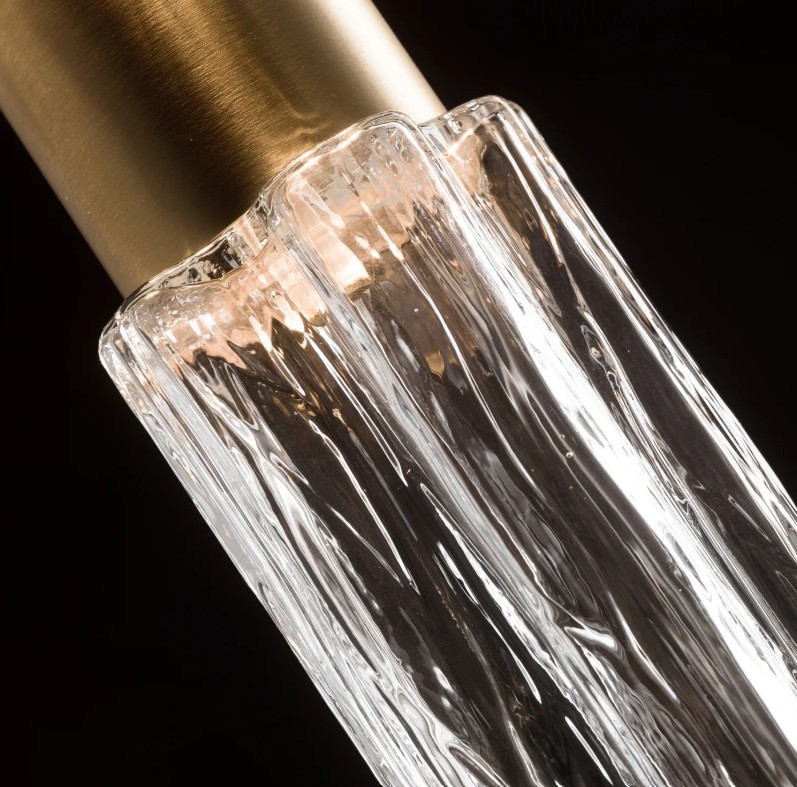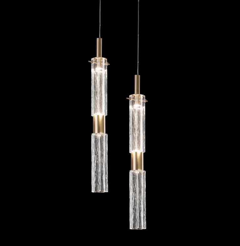 Cylindryczna konstrukcja z mosiądzu pokrytego 24-karatowym złotem ozdobiona jest dwoma elementami ze szkła Murano – górny pełni funkcję klosza rozpraszającego światło z umieszczonej wewnątrz żarówki LED, natomiast dolny odbija światło, dodając przestrzeni subtelnego blasku.