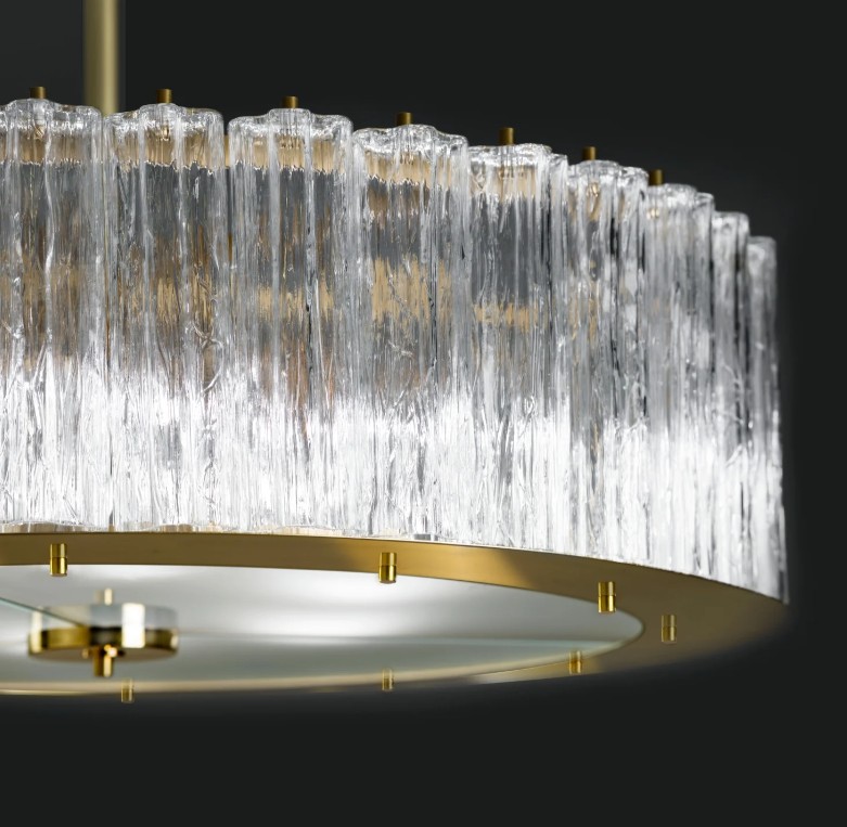 Bezpośrednio inspirowany okazałym i odważnym stylem Art Deco, ten niezwykły żyrandol Drum stanie się efektownym elementem każdego wnętrza. Jego okrągła rama z mosiądzu pokrytego 24-karatowym złotem ozdobiona jest serią elementów ze szkła Murano, tworząc przepiękną, biżuteryjną kompozycję, która załamuje światło w środku, nadając wnętrzu glamour zarówno w aranżacjach klasycznych, jak i współczesnych.