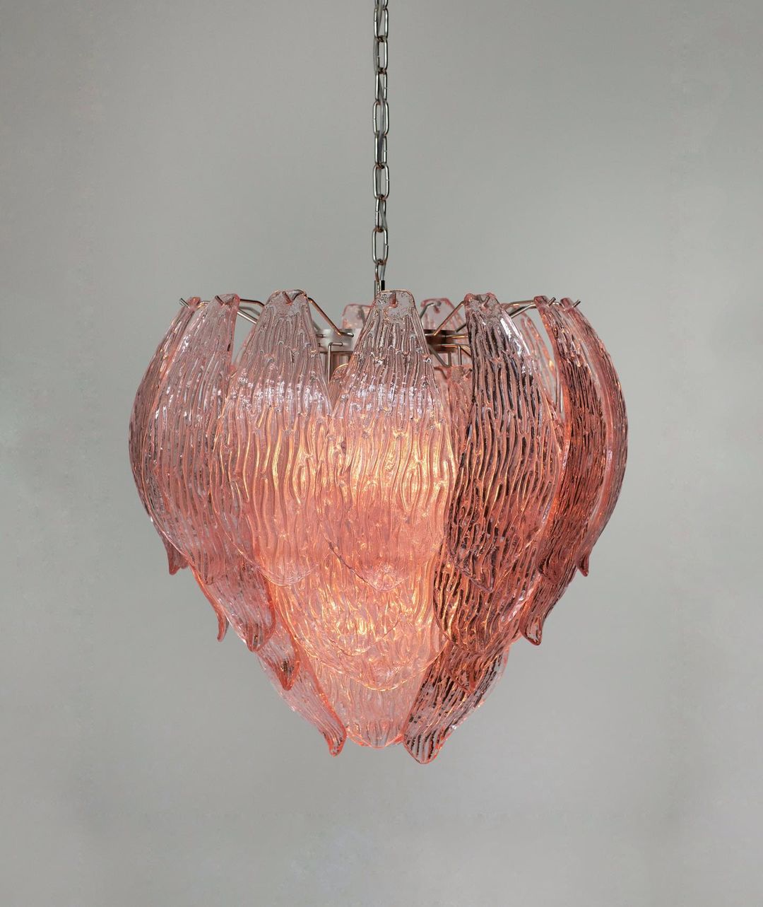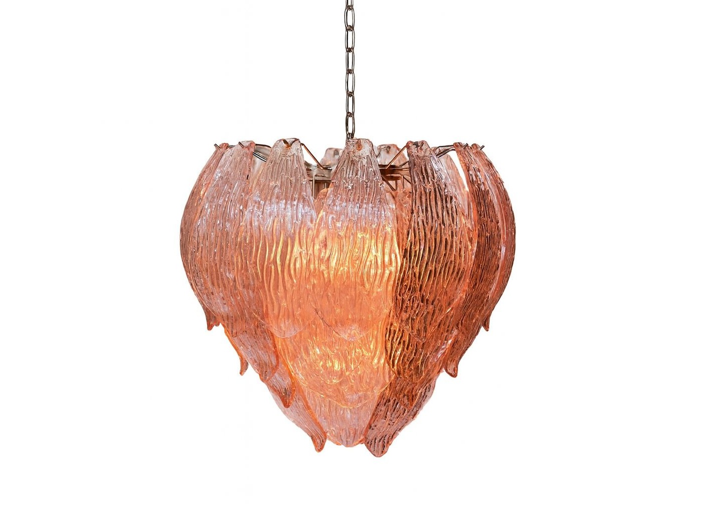 Żyrandol złożony z 38 różowych, szklanych elementów. Każdy detal to prawdziwe dzieło sztuki, ręcznie wykonany przez mistrzów szkła. Forma żyrandola przypomina pąk kwiatu, co dodatkowo wzmacnia jego wyrafinowaną i artystyczną estetykę.