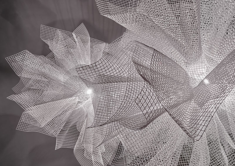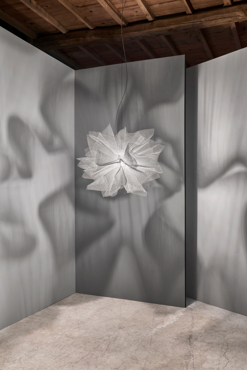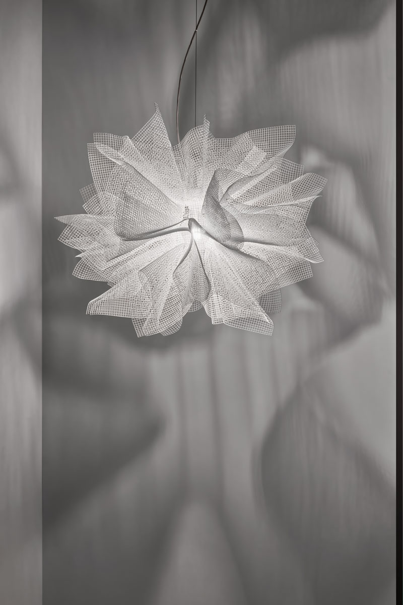 Lampa Fluo, zaprojektowana przez Arturo Álvareza, należy do kolekcji lamp wiszących stworzonych z welonów z malowanej, ocynkowanej siatki stalowej, subtelnie połączonych wokół jednego źródła światła.
