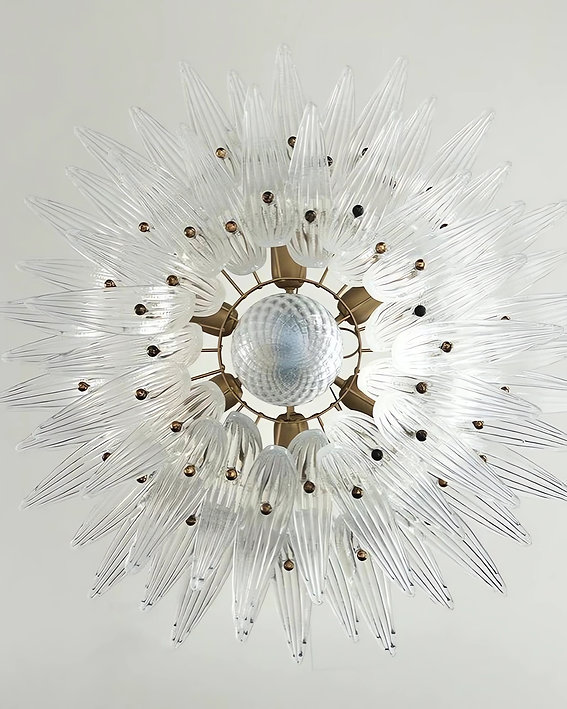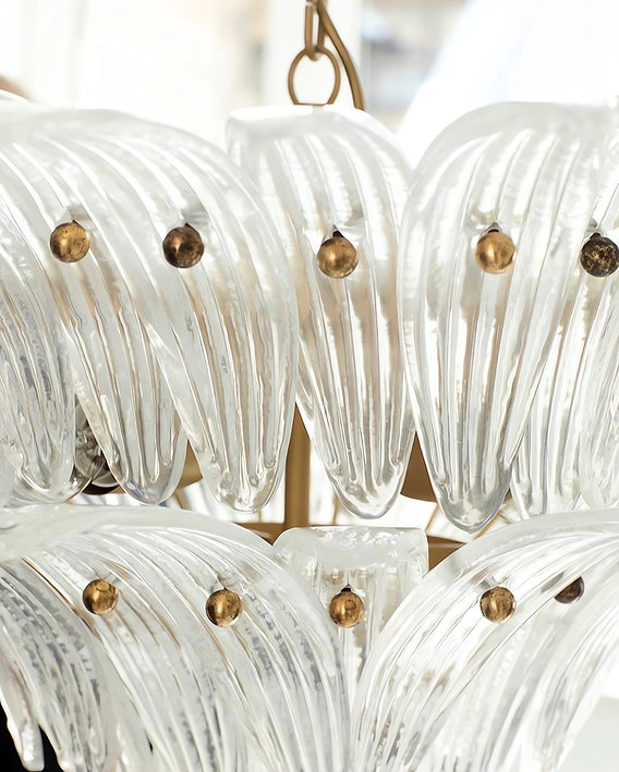 Żyrandol składa się z 58 przezroczystych szklanych liści, które zostały starannie zamocowane do metalowej podstawy za pomocą mosiężnych kulek. Kompozycję wieńczy reliefowa kula. Metalowa podstawa oraz mosiężne akcenty pięknie kontrastują z delikatnością szklanych elementów.