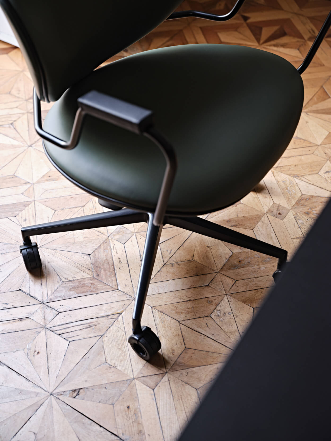5-punktowa podstawa w formie gwiazdy, wykonana z odlewanego aluminium, pomalowana na matową czerń. Fotel wyposażony jest w miękkie, samohamujące kółka, które zapewniają łatwość przemieszczania.
