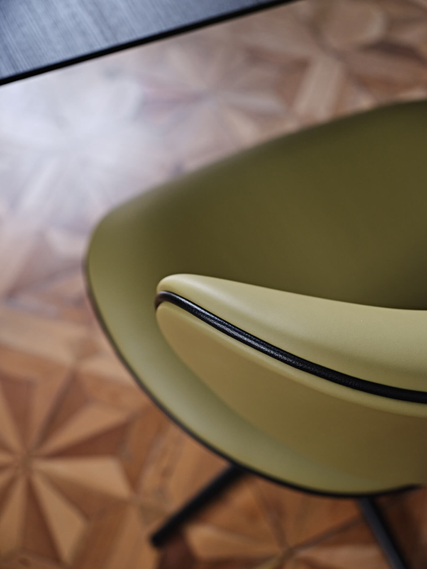 Obrotowa podstawa; siedzisko i oparcie z giętego drewna bukowego, z wypełnieniem z wysokoelastycznej pianki poliuretanowej (HR) dla długotrwałego komfortu.