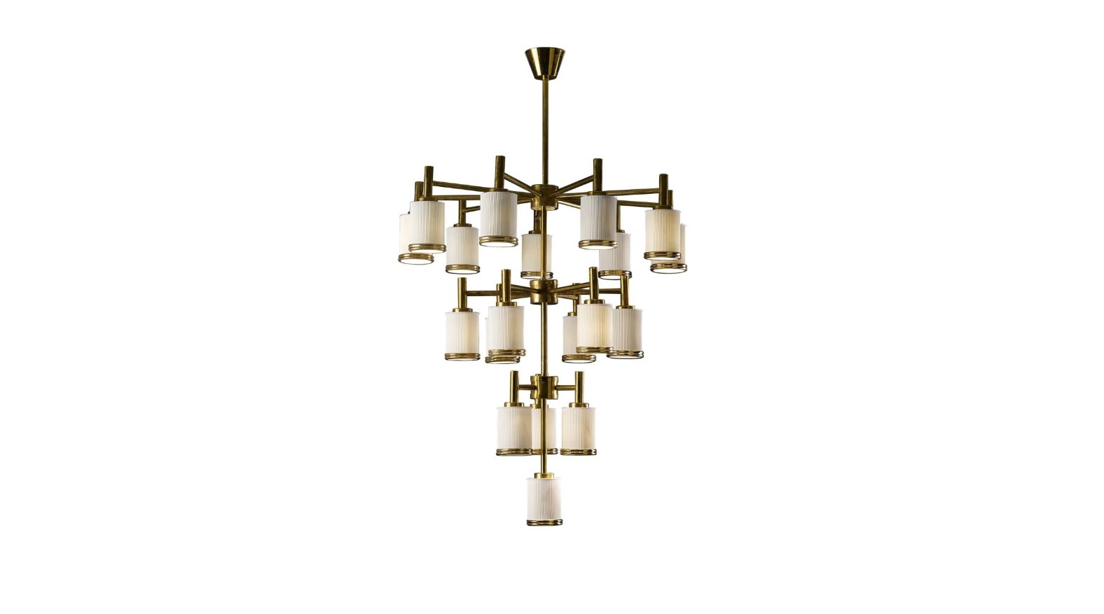 Konstrukcja z mosiądzu, ułożona w trzy poziomy i wyposażona w 19 żarówek osłoniętych cylindrycznymi kloszami z porcelany, sprawia, że żyrandol jest idealny do stworzenia retro-chic atmosfery w eleganckim wnętrzu.