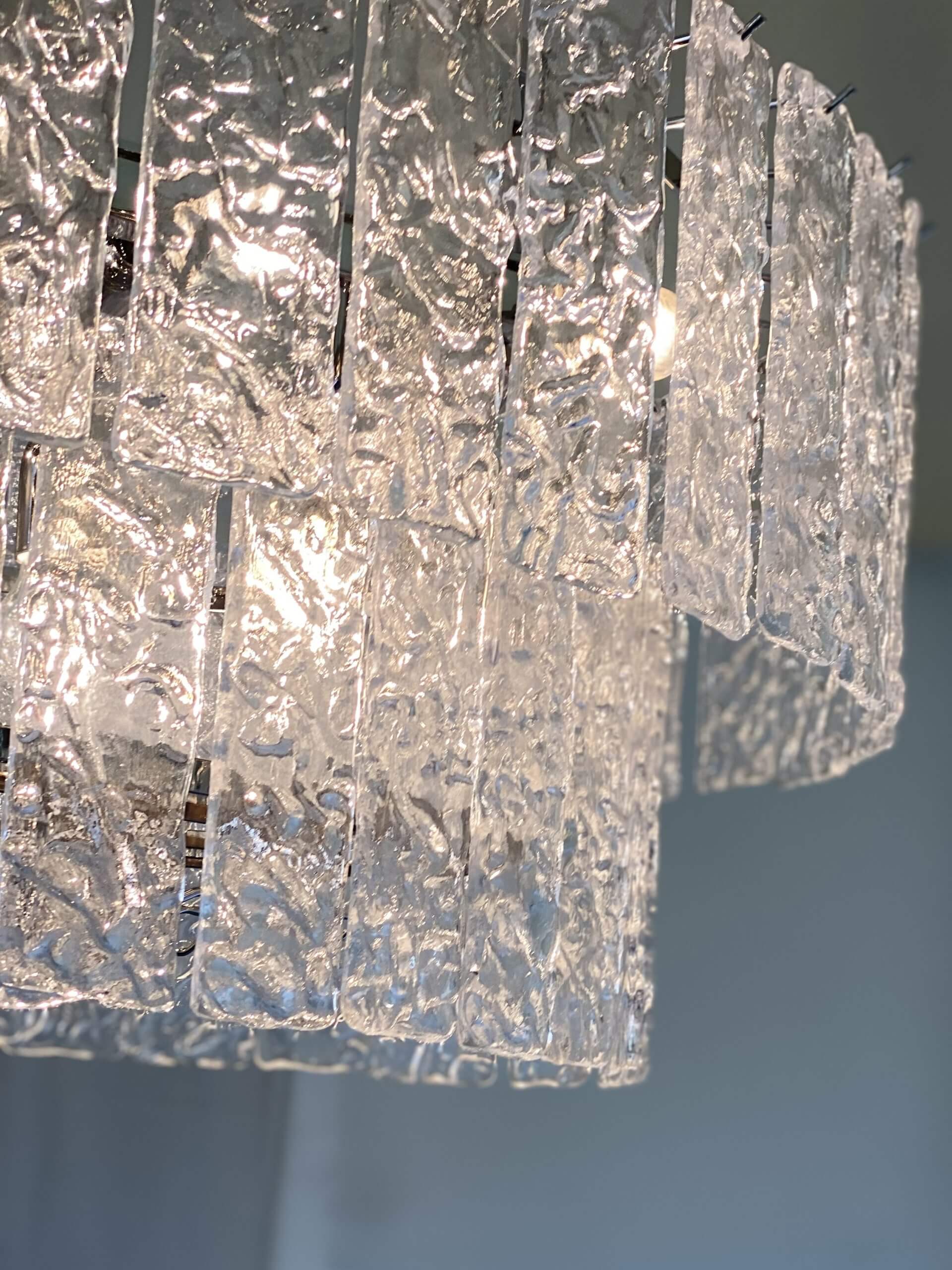 Współczesny owalny żyrandol “HAMMERED Listelli” wykonany z pasków szkła Murano, uformowanych metodą “piastra” (na płycie) – tradycyjną techniką weneckiego rzemiosła.