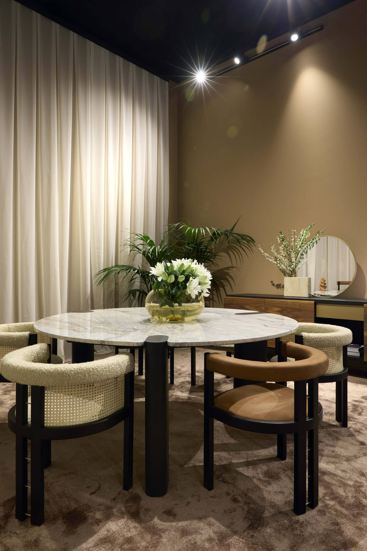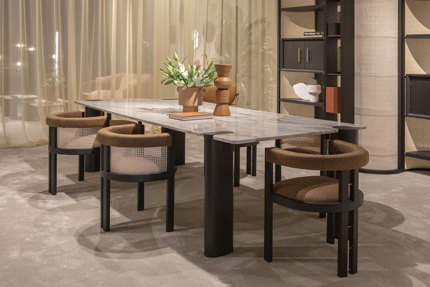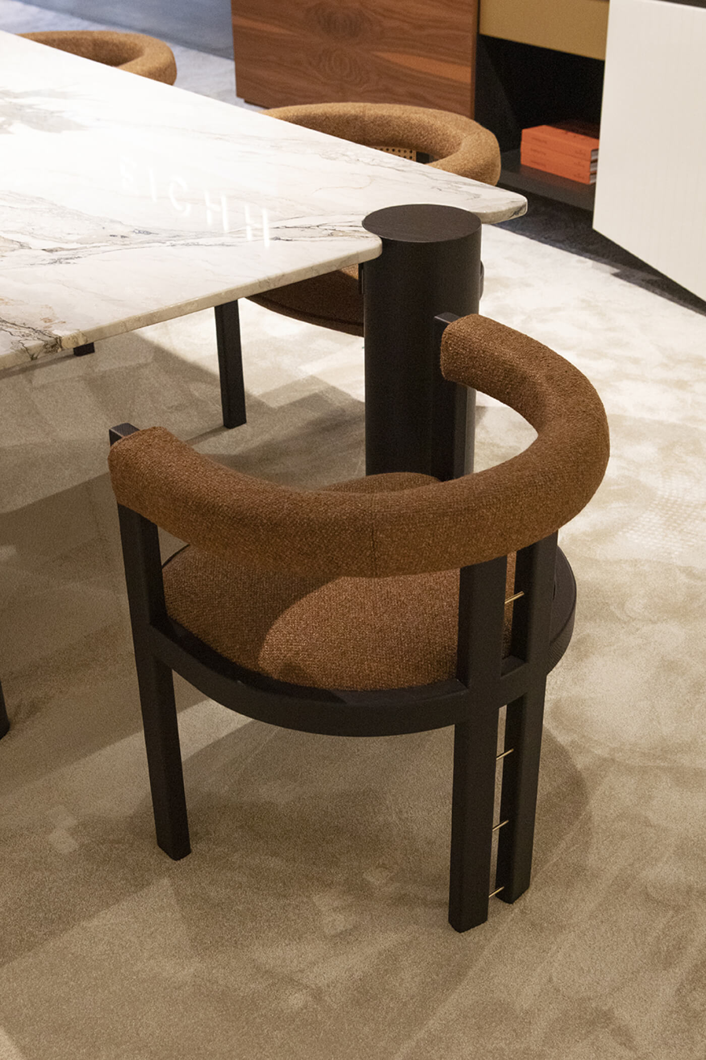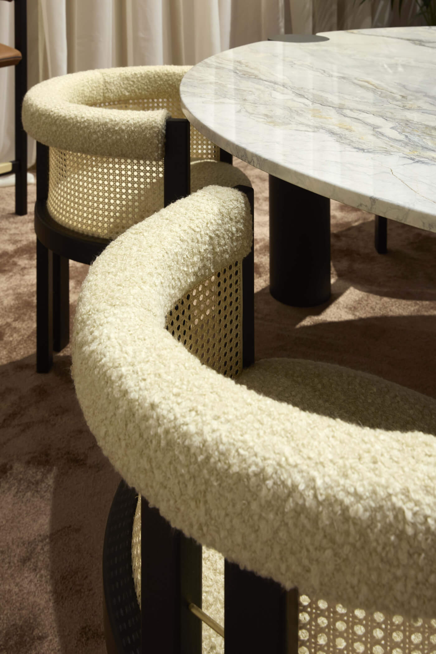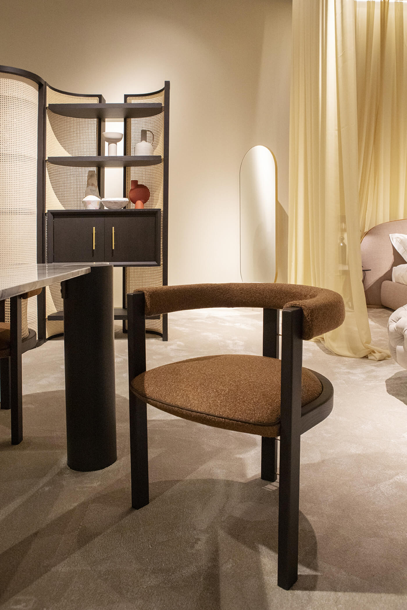 Kumiko czerpie inspirację z litego drewna i jego nieskończonych możliwości tworzenia ażurowych splotów. To krzesło o solidnej, wytrzymałej konstrukcji, które jednocześnie oferuje wysoki komfort – miękkie wypełnienie sprzyja długim kolacjom z przyjaciółmi i wielogodzinnym spotkaniom przy stole.