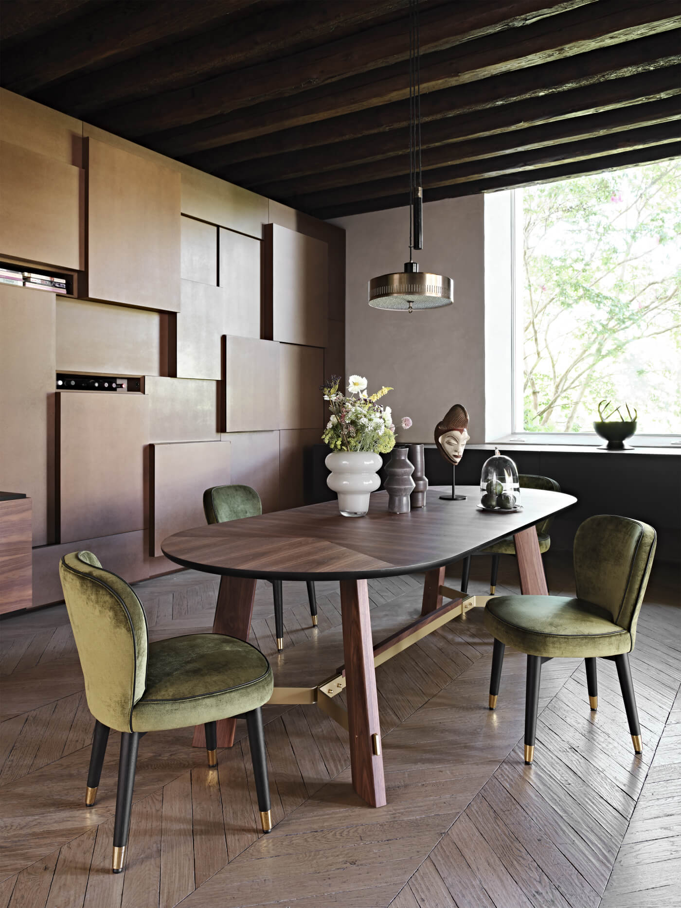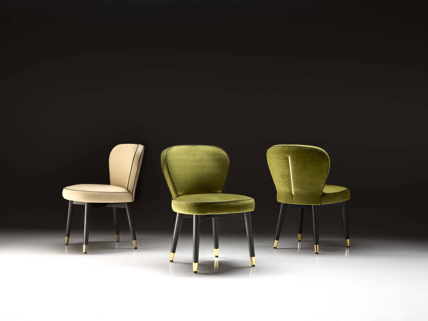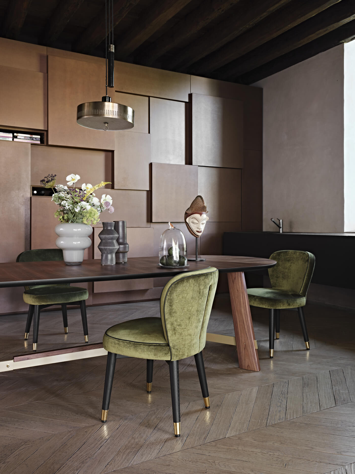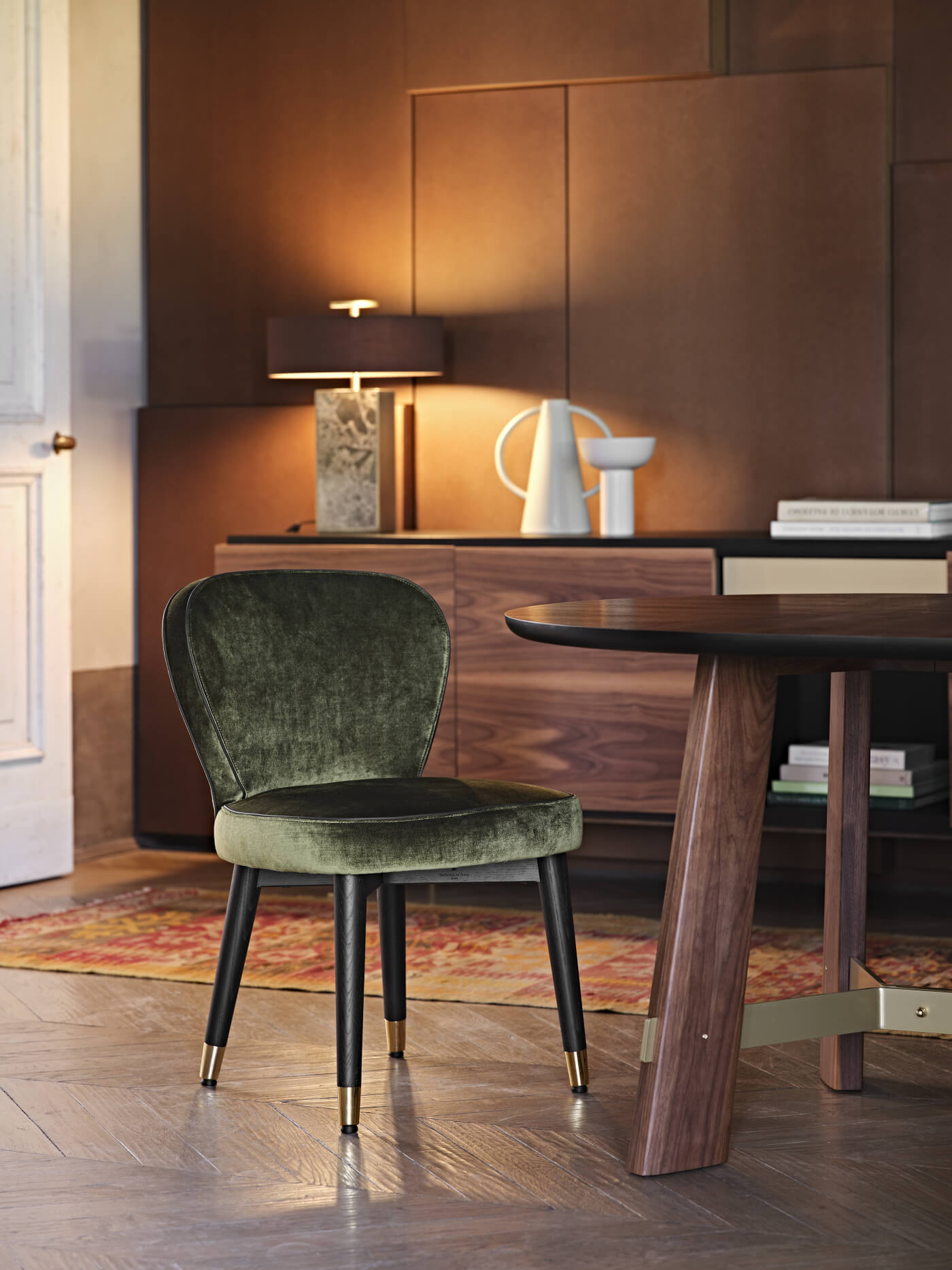 Kontrastowa lamówka rysuje elegancki profil krzesła Olivia. Niezmiennie wyczuwalny „Made in Italy” sprawia, że to nie tylko przedmiot o wrodzonej, nowoczesnej urodzie, lecz także wysmakowany must-have dla miłośników wyrafinowanego designu. Wygodne, obszerne siedzisko spoczywa na nogach z litego jesionu wybarwionego na odcień moka lub z orzecha Canaletto. Tapicerowane nóżki zwieńczono metalowymi zakończeniami w wykończeniu polerowanego złota lub matowego ciemnego brązu, co dodaje całości subtelnego uroku. Olivia to esencja włoskiej doskonałości — do codziennego doświadczania przy każdym posiłku.