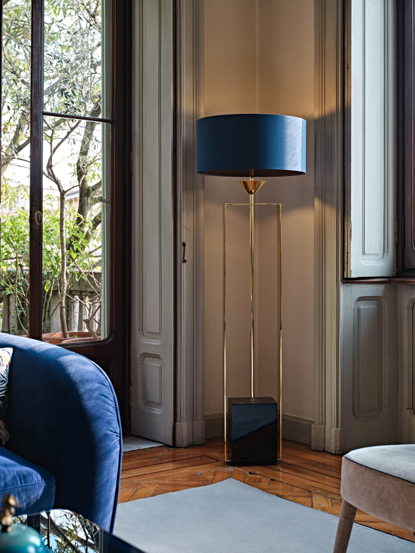 Dekoracyjna lampa podłogowa o świetle rozproszonym i skierowanym w dół. Podstawa lakierowana na ciemny granat; konstrukcja metalowa w wykończeniu polerowane złoto.