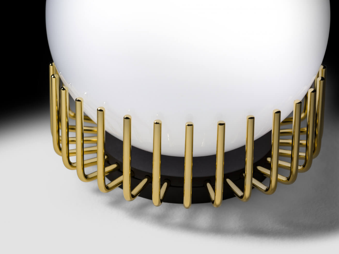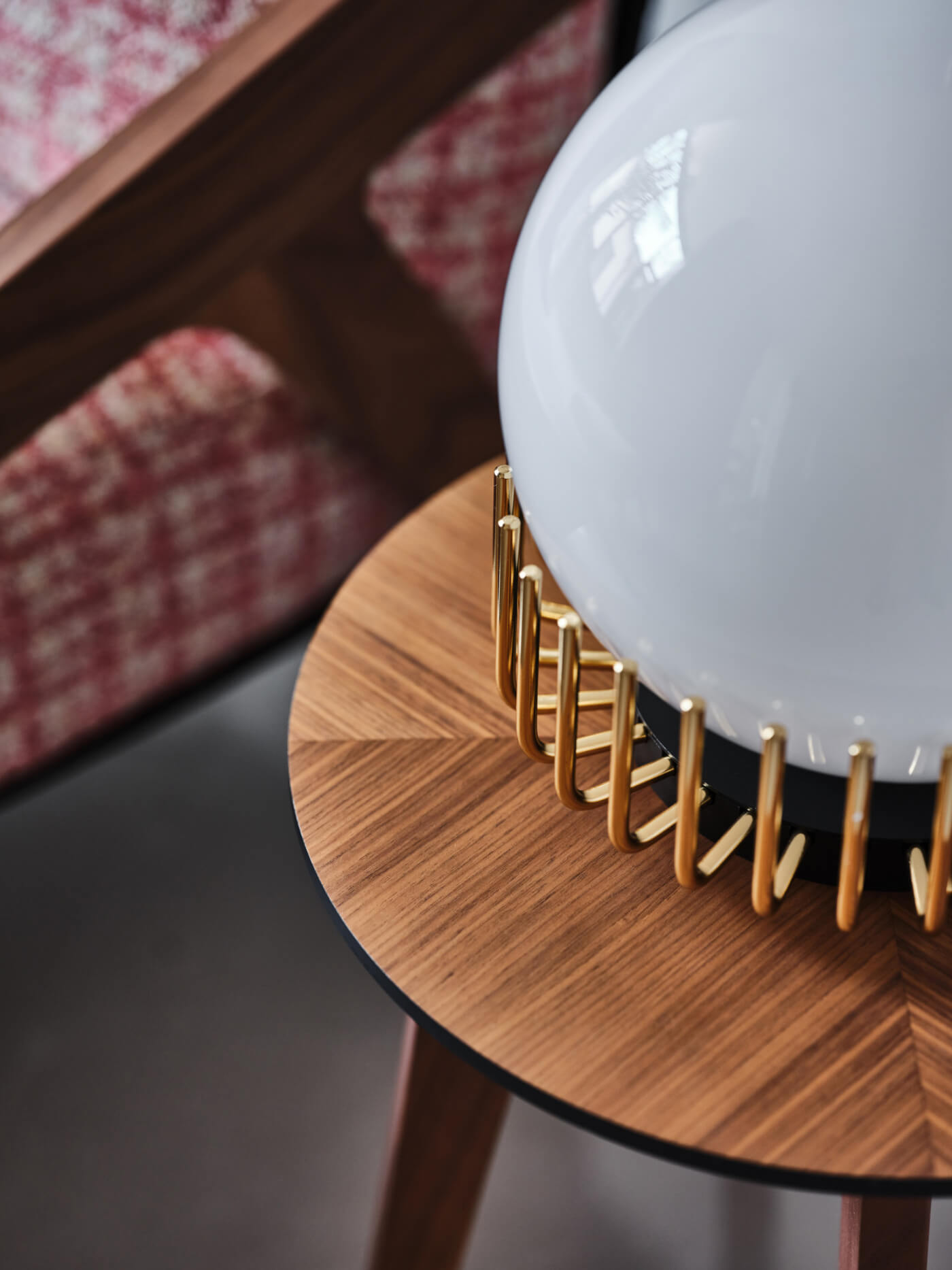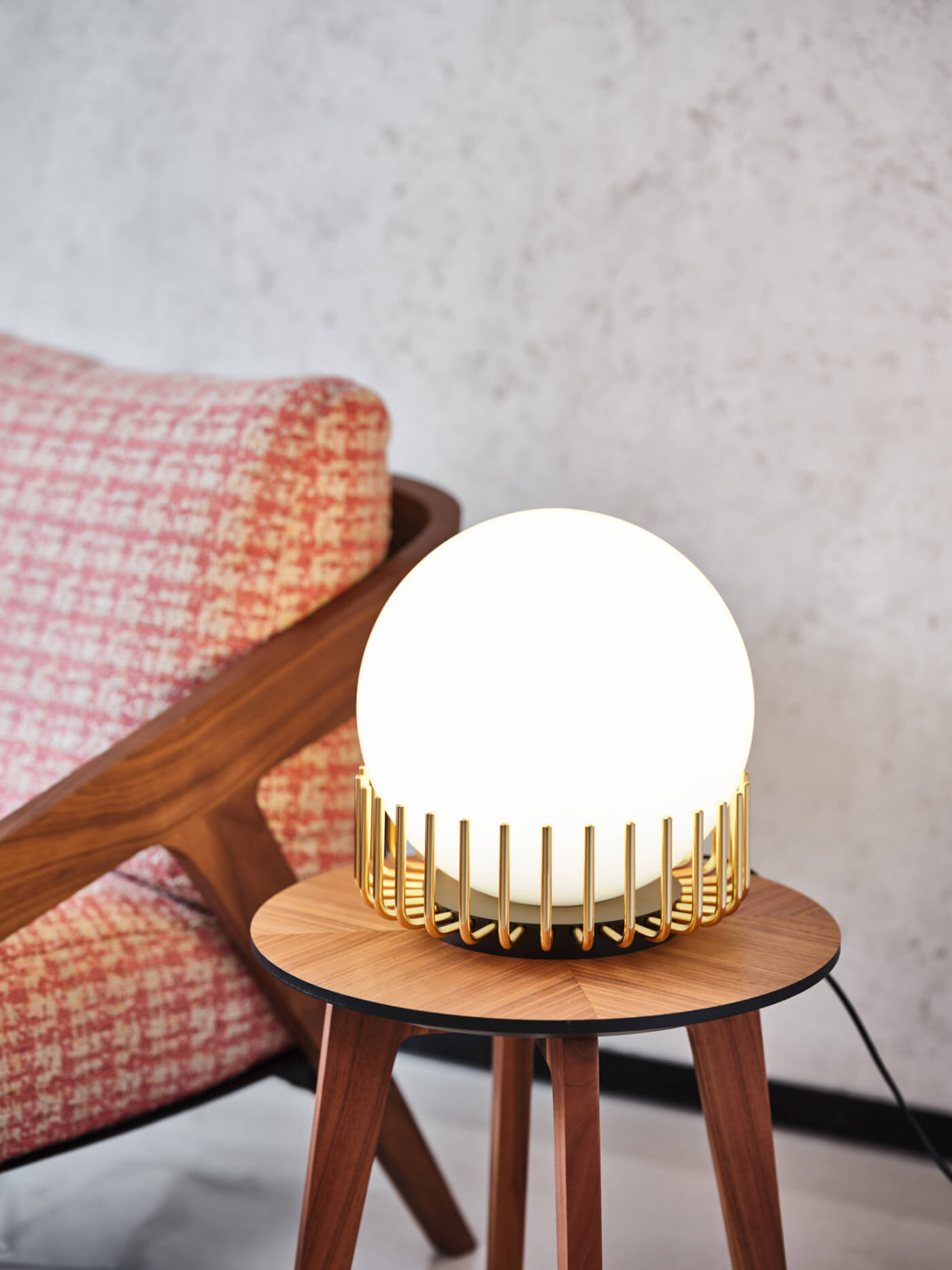 Miękkie, subtelne światło opalizującej kuli spoczywa na złotym akcencie o wyważonych, lekkich proporcjach — czystość formy, prostota i perfekcja. Lucy to lampa, która dopełnia brakujący punkt światła w eleganckich strefach dziennych, a dzięki kameralnemu charakterowi doskonale sprawdza się także na stolikach nocnych.