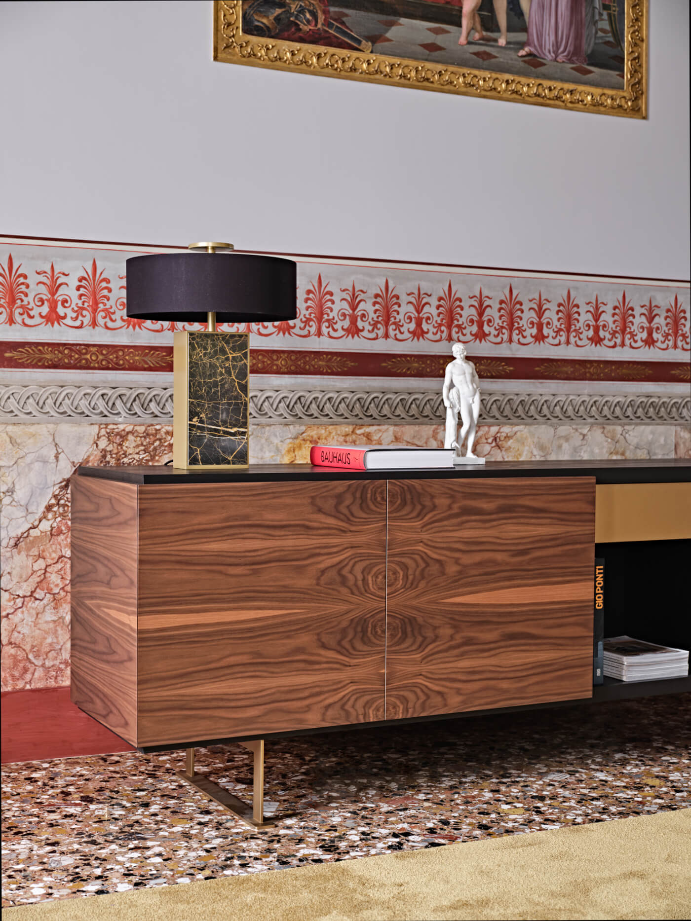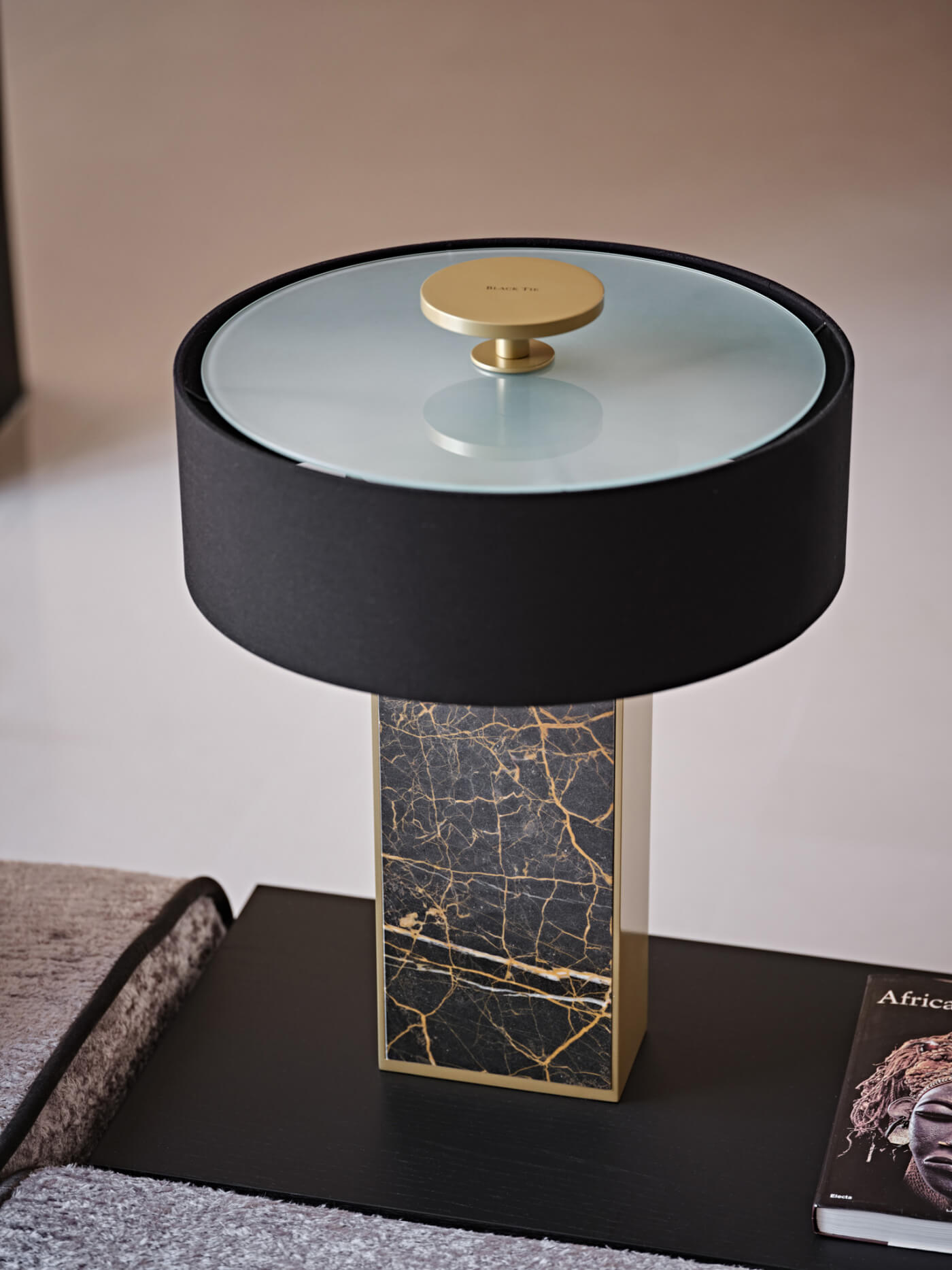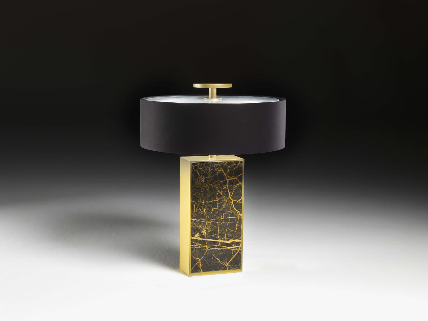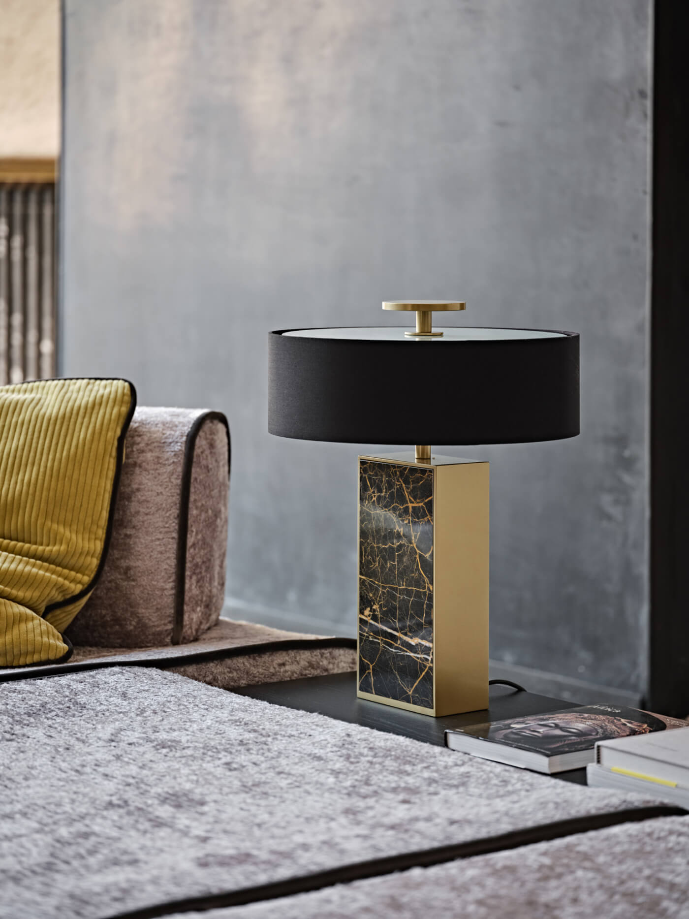 Wyjątkowa lampa stołowa, która sprawdzi się jako singularny akcent w zróżnicowanych aranżacjach. Korpus wykonany z marmuru Port Laurent podkreśla szlachetny charakter, a detale metalowe w wykończeniu matowe złoto dodają elegancji. Kompozycję dopełnia czarny, sztywny abażur, który nadaje całości wyrazistego, luksusowego tonu.