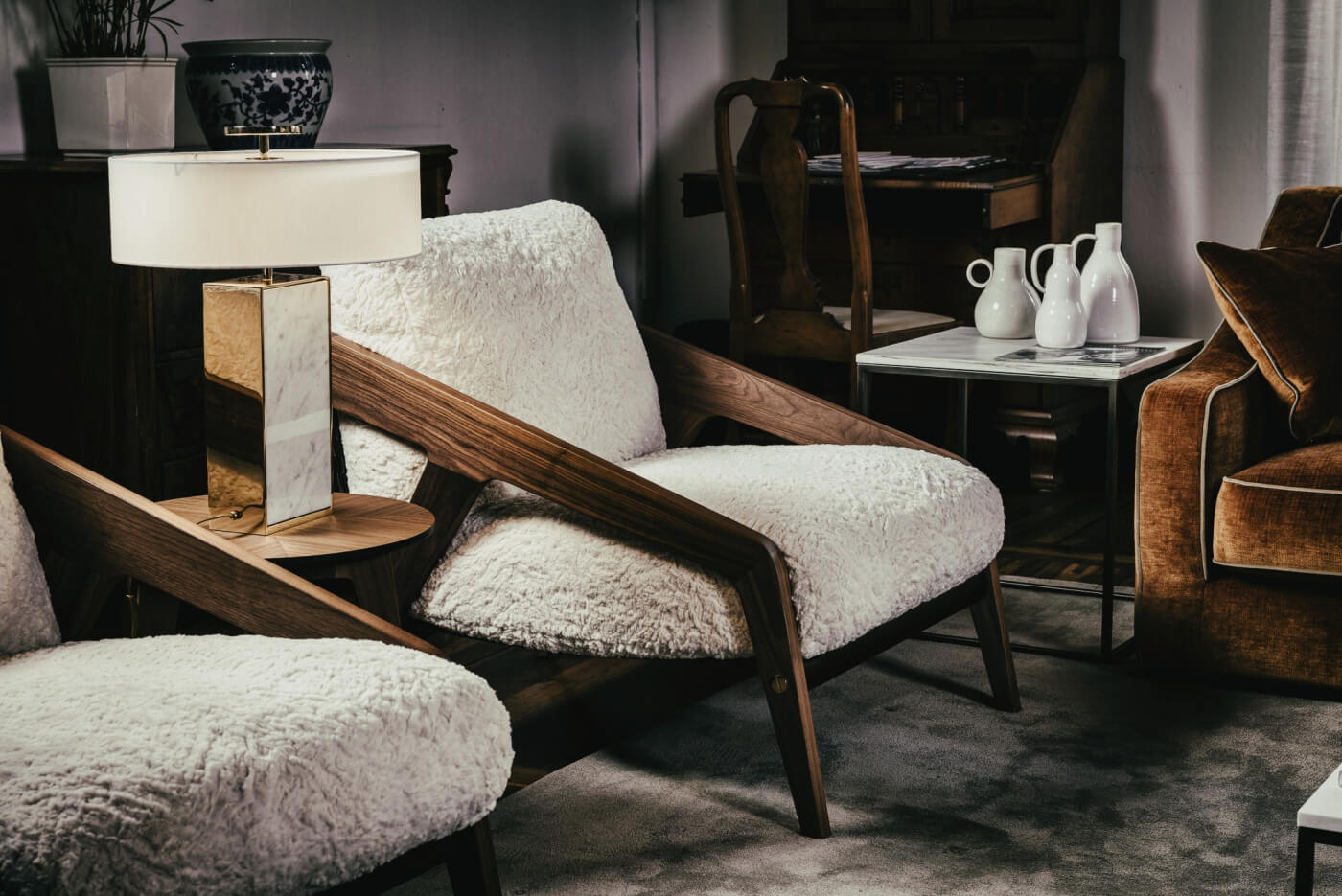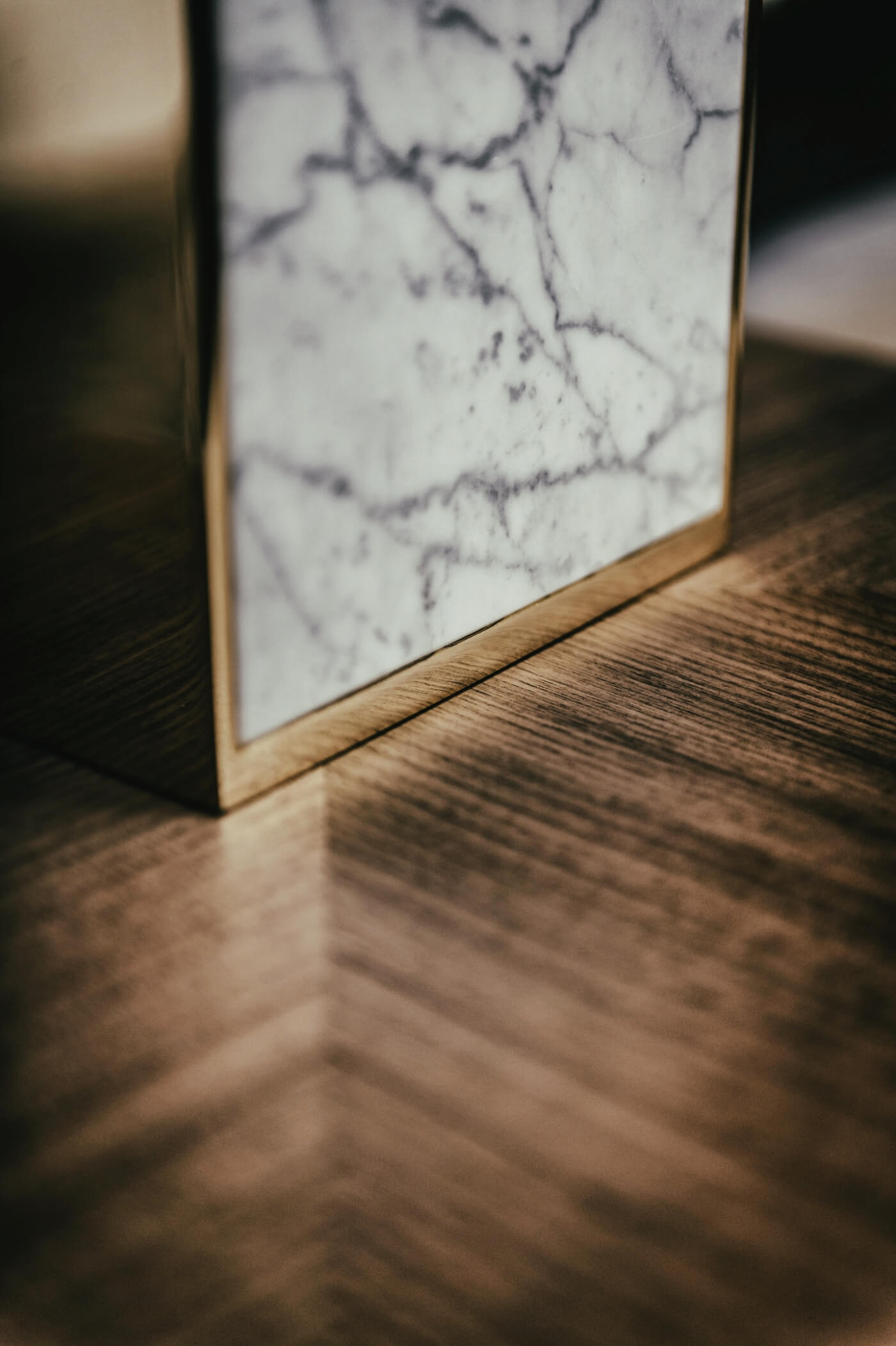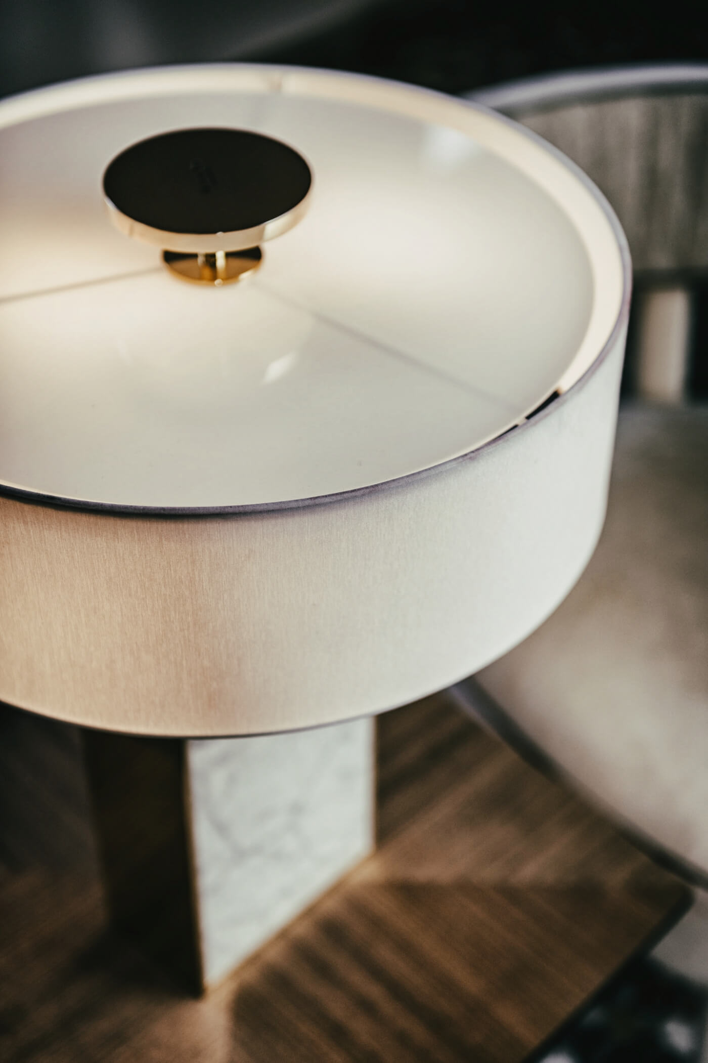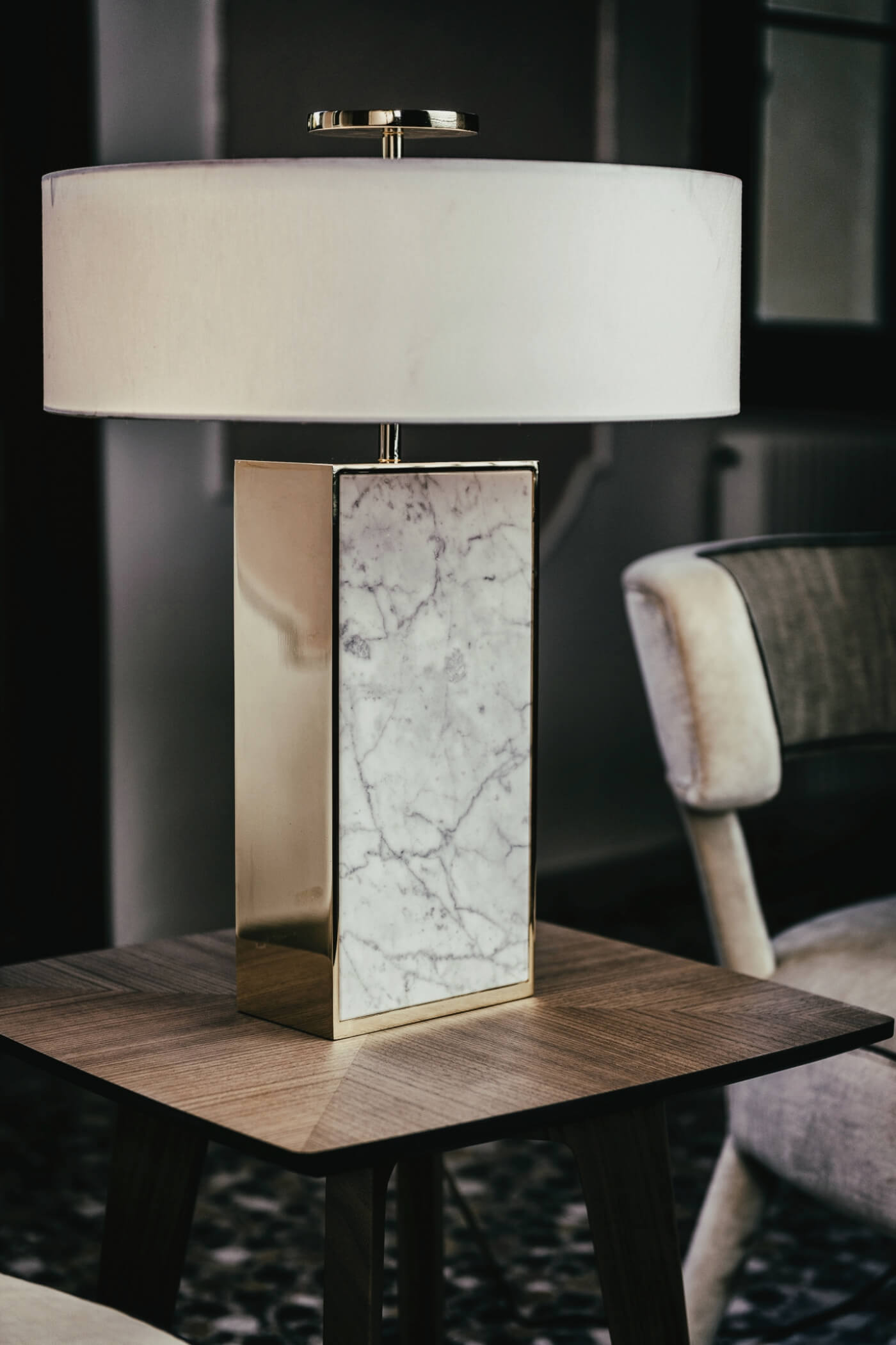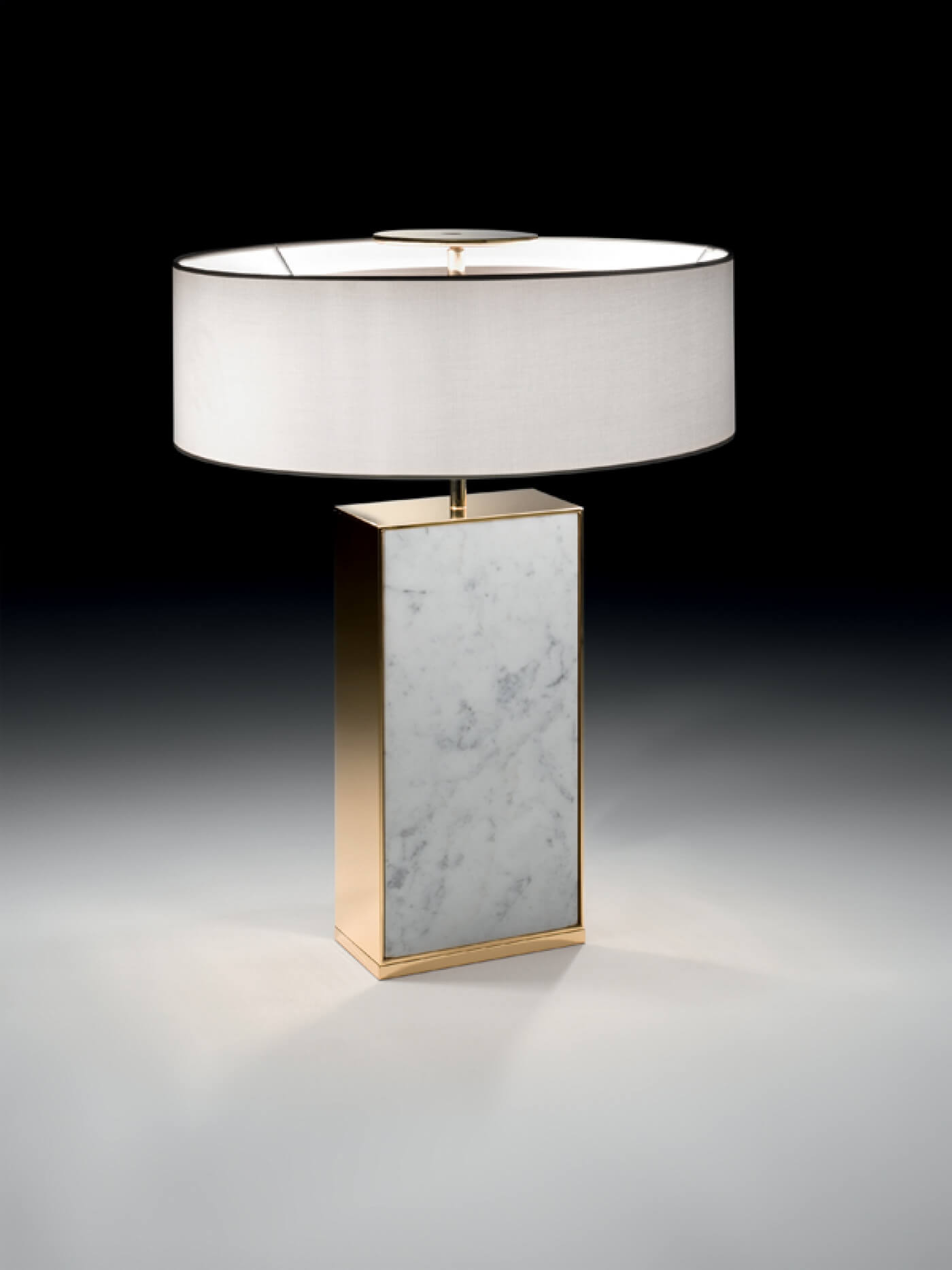 Dekoracyjna lampa stołowa o świetle rozproszonym i skierowanym w dół. Korpus centralny z marmuru Carrara; elementy metalowe w wykończeniu polerowane złoto.