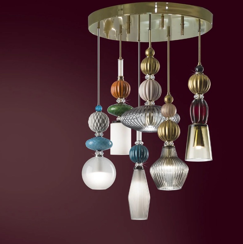 Ta przepięknie okazała lampa, składająca się z szeregu lamp wiszących zawieszonych na mosiężnej tarczy pokrytej 24-karatowym złotem, inspirowana jest biżuterią. Unikalne zestawienie porcelany o różnych kształtach i tłoczonych wzorach oraz ręcznie dmuchanego szkła Murano sprawia, że każdy z sześciu zwisów emanuje luksusem i subtelnym blaskiem. Zgrupowane razem tworzą efektowny element dekoracyjny, który zachwyci w każdym wnętrzu. Przygotuj się na prawdziwe oczarowanie! Wysokość żyrandola wynosi 205 cm i może być regulowana na zamówienie.