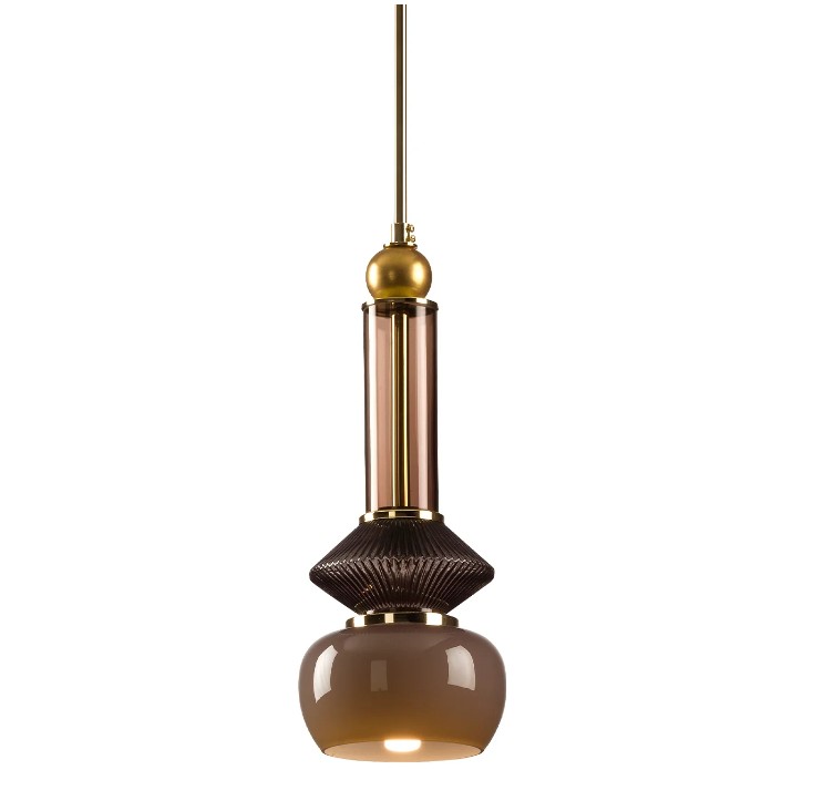 Pionowy przewód ze złotej tkaniny ozdobiony jest kompozycją elementów z porcelany i szkła Murano, których powierzchnię zdobią delikatne żłobienia. Całość wieńczy klosz z ręcznie dmuchanego szkła Murano, dopełniając tę wyjątkową, artystyczną kompozycję.