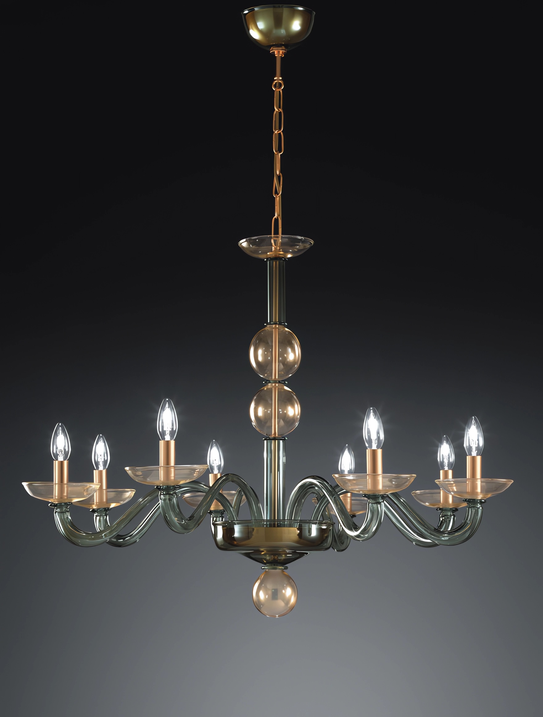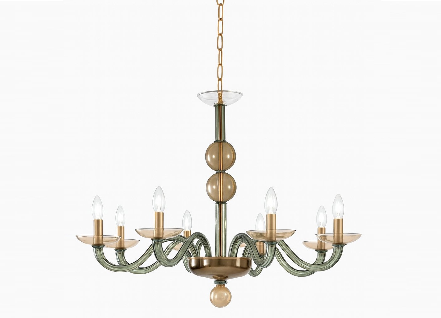 Żyrandol wykonany z połączenia złotego i ciemnozielonego szkła. Jego minimalistyczna forma idealnie pasuje do nowoczesnych wnętrz. Można go zestawić z kinkietem utrzymanym w tym samym stylu, tworząc spójną, elegancką aranżację oświetleniową.