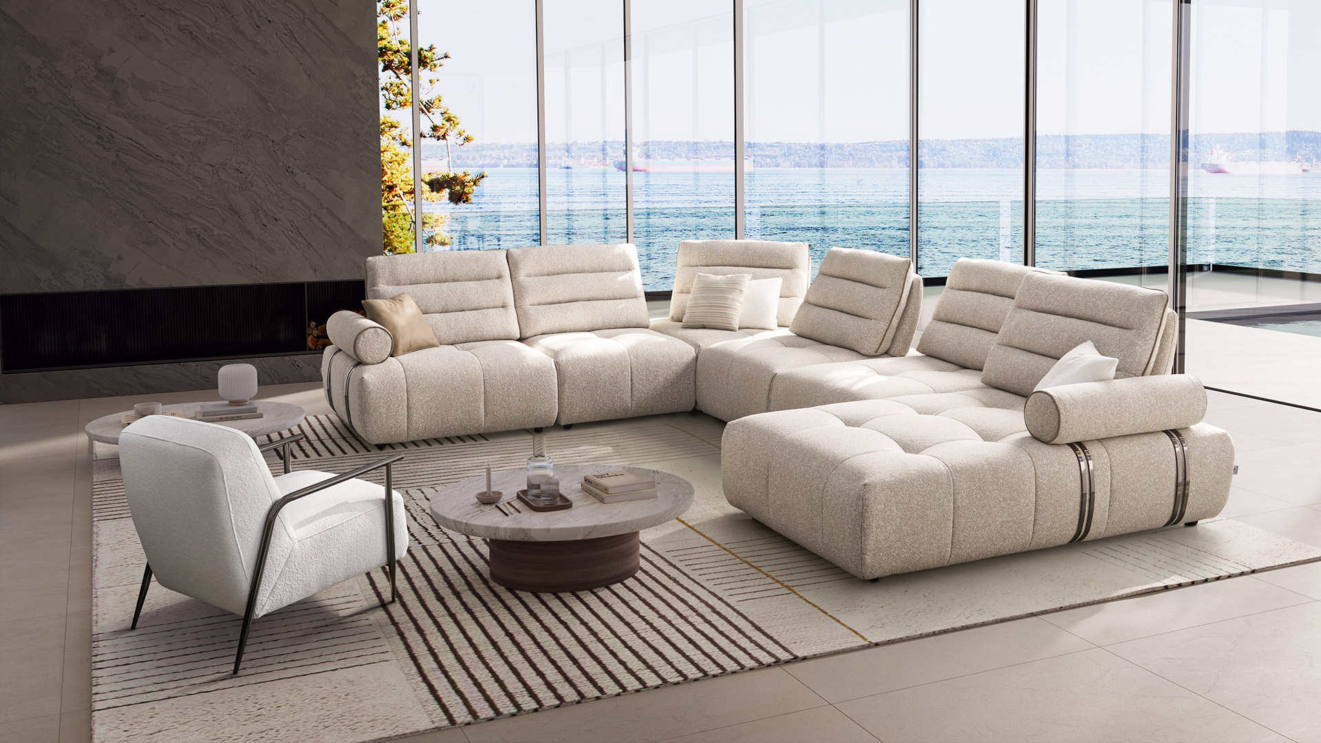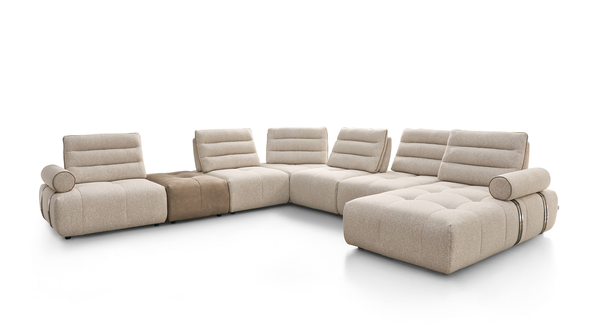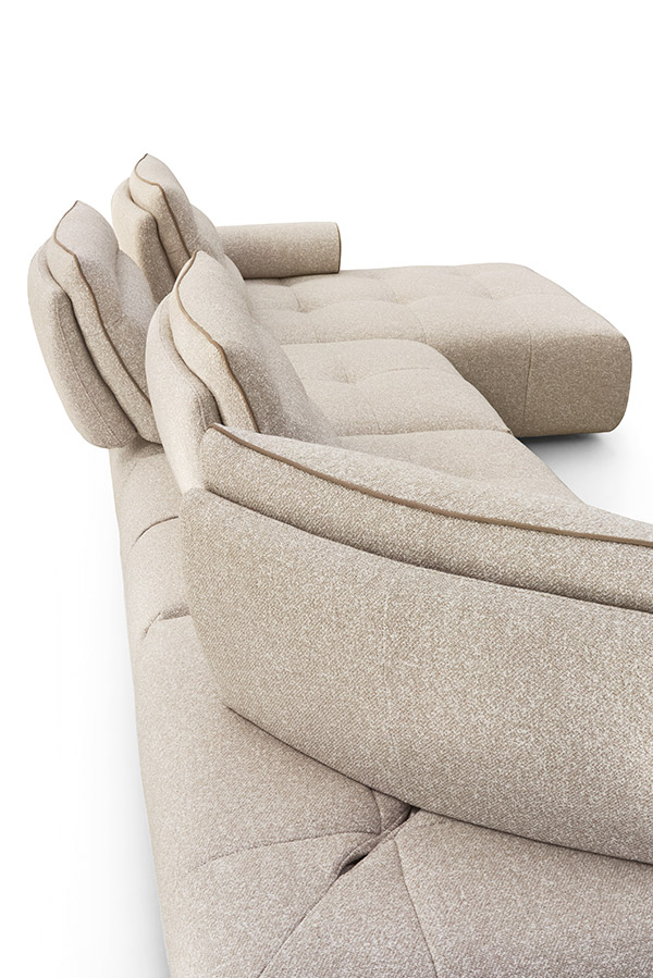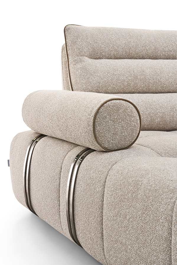Nowoczesna, wyrafinowana forma odzwierciedla piękno prostoty. Nisko osadzone siedzisko i szeroka powierzchnia wypoczynkowa zapewniają wyjątkowy komfort, a cylindryczny podłokietnik, wzbogacony o ekskluzywny metalowy detal, podkreśla estetykę i wyrafinowanie tego projektu.