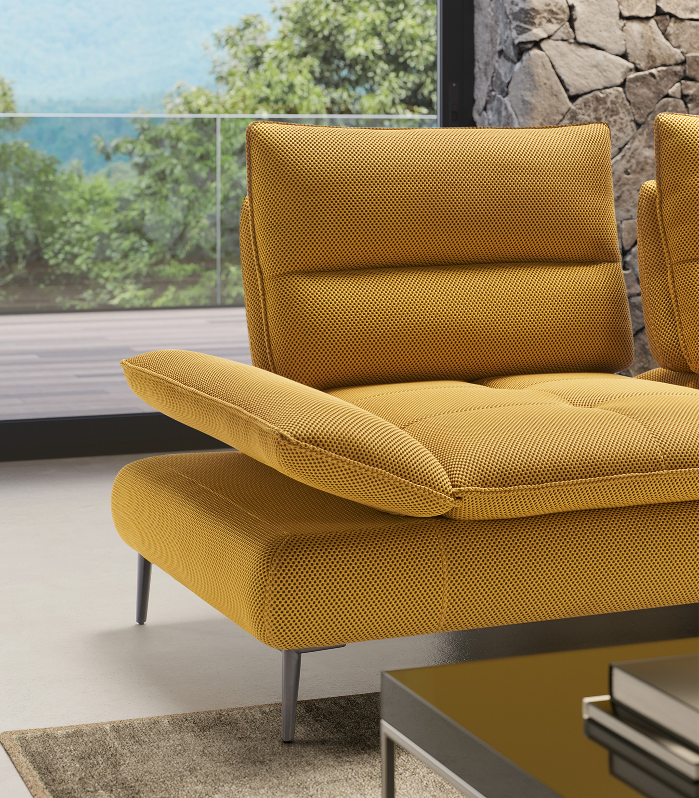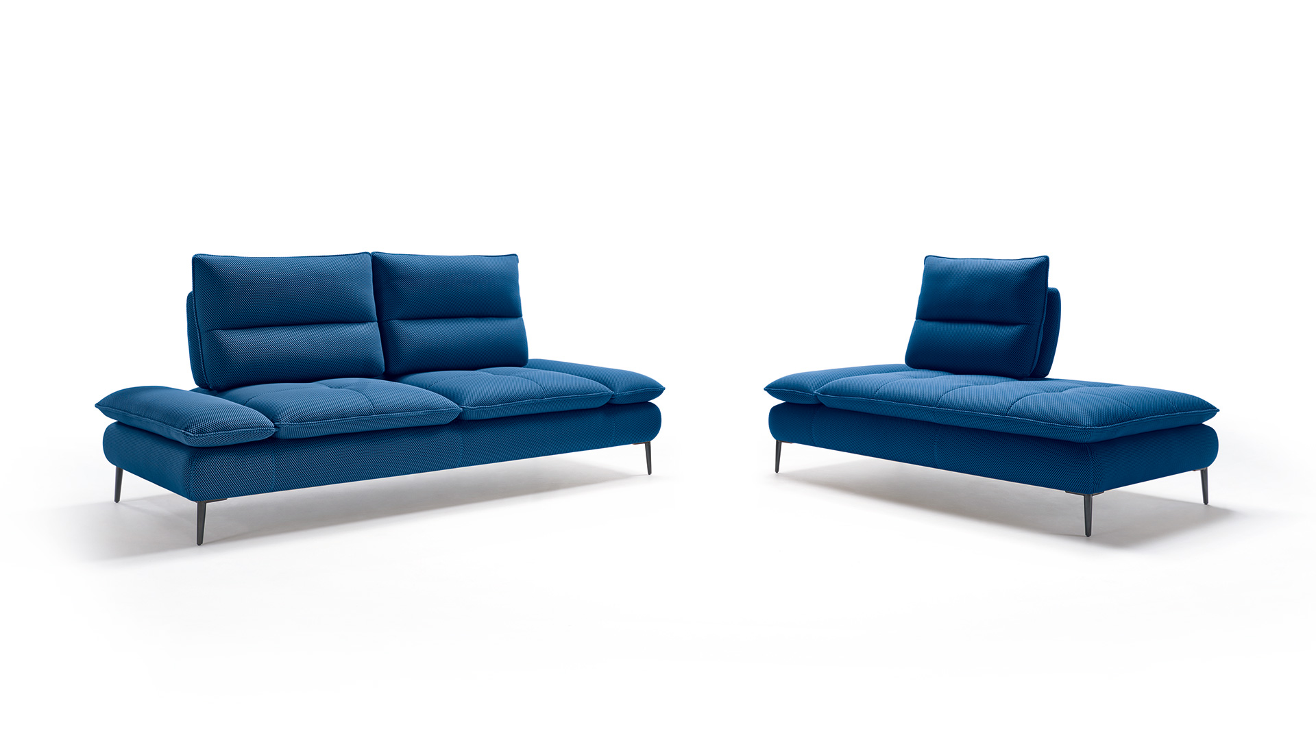 Charakterystyczne, smukłe nóżki w wykończeniu tytanowym podtrzymują liniową, minimalistyczną bryłę, która sprawia wrażenie zawieszonej w przestrzeni. System przesuwnego oparcia umożliwia regulację głębokości siedziska, zapewniając jeszcze większy komfort.