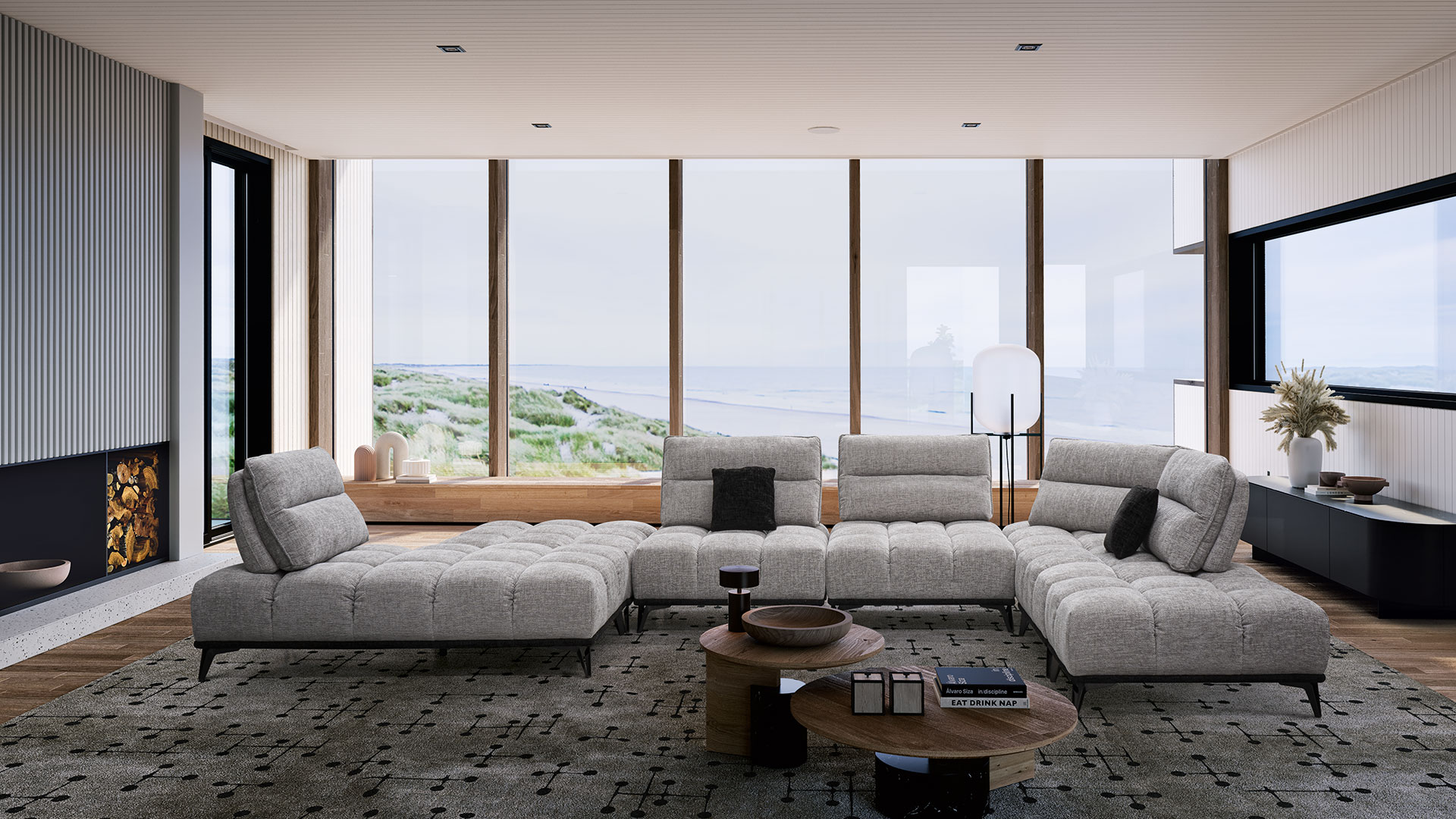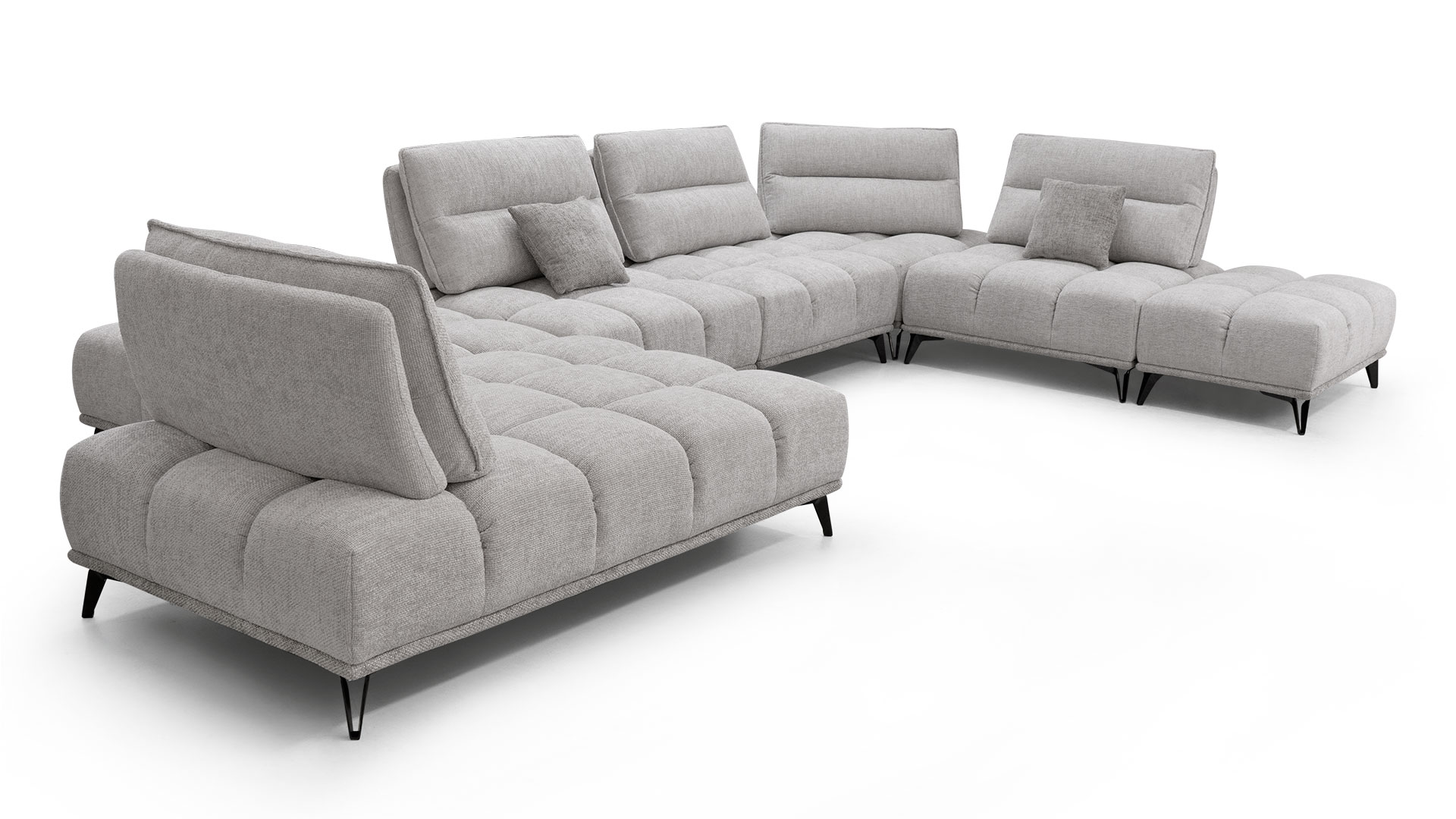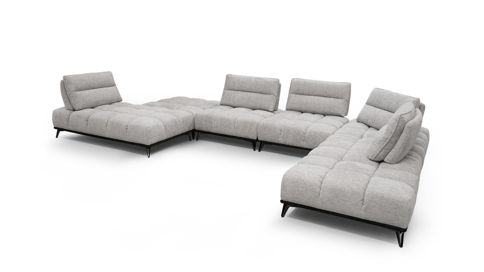 Sofa Positano wyróżnia się połączeniem wysokich nóżek, modułowej konstrukcji oraz precyzyjnych, geometrycznych przeszyć, co nadaje mu nowoczesny i elegancki charakter, idealny do współczesnych, stylowych wnętrz. Podniesienie sofy zapewnia wizualną lekkość oraz tworzy otwartą przestrzeń pod meblem, co sprzyja utrzymaniu poczucia przestronności w pomieszczeniu. Każdy moduł został zaprojektowany z dużą precyzją, umożliwiając konfiguracje dostosowane do indywidualnych potrzeb przestrzeni wypoczynkowej.