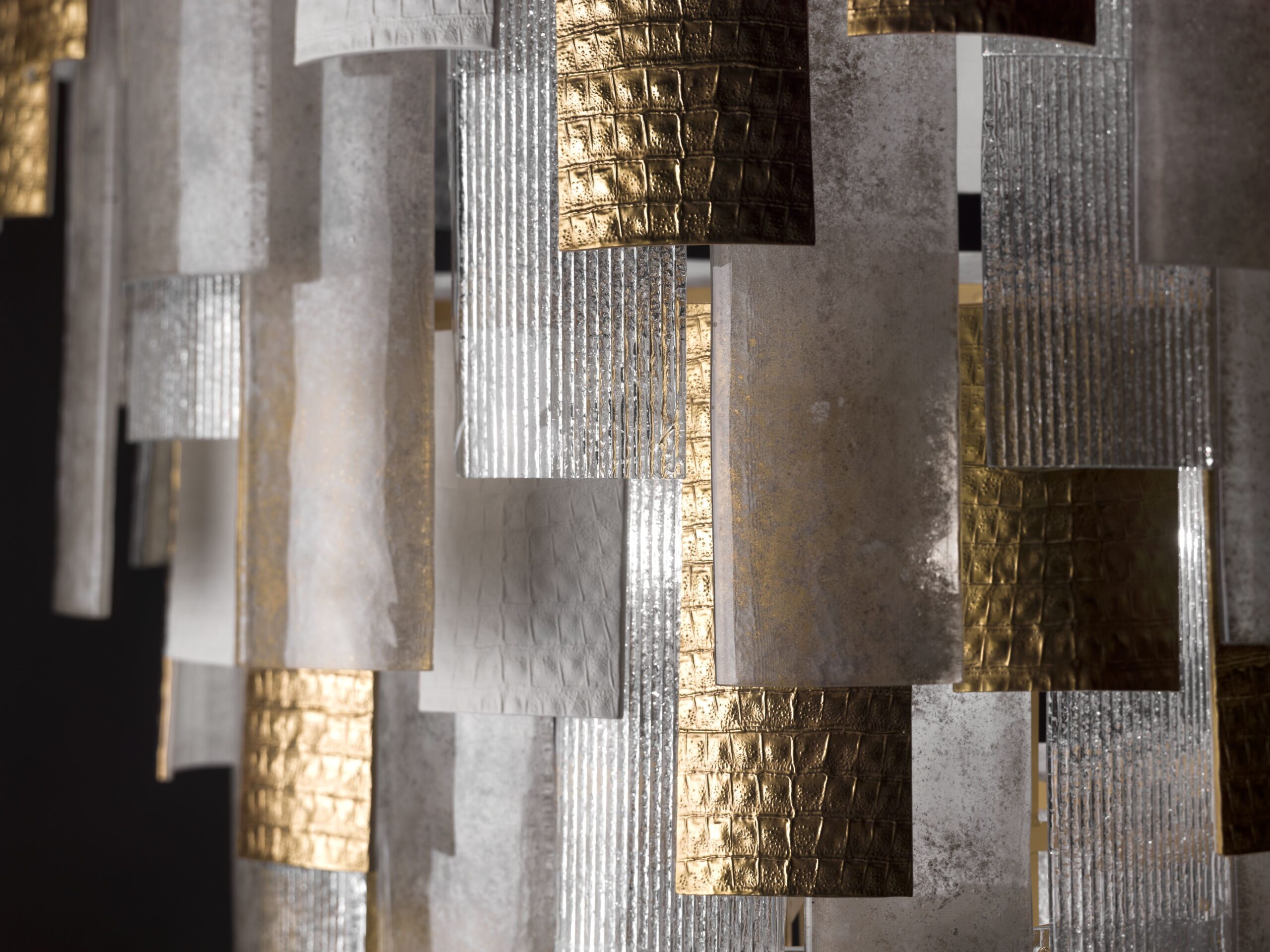 Mosiężna rama podtrzymuje kaskadę matowych paneli ze szkła Murano z głęboko tłoczonymi, pionowymi żłobieniami. Porcelanowe panele malowane ręcznie 24-karatowym złotem, zdobi motyw przypominający skórę krokodyla. Sześć żarówek umieszczonych pod spodem emituje intensywne, subtelne światło, tworząc wyjątkowy nastrój.